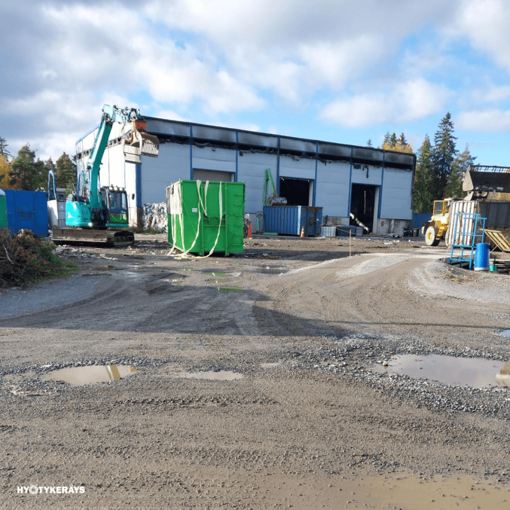Olemme saaneet vakuutusyhtiöltä luvan aloittaa pihan siivouksen tapahtumien jälkeen. Hallissa sisällä palanut materiaali levitettiin paloyönä pyöräkuormaajan avulla kytevästä kasasta piha-alueelle, jossa sitä sammutettiin ja kasteltiin. Nyt palanut materiaali saadaan kuljettaa terminaaliltamme eteenpäin.